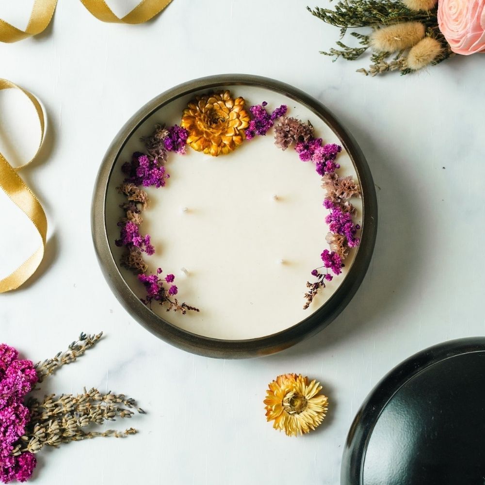 Antique Finish Urli Candle | 7" with Lid | Dry Flower Soy Wax Candle