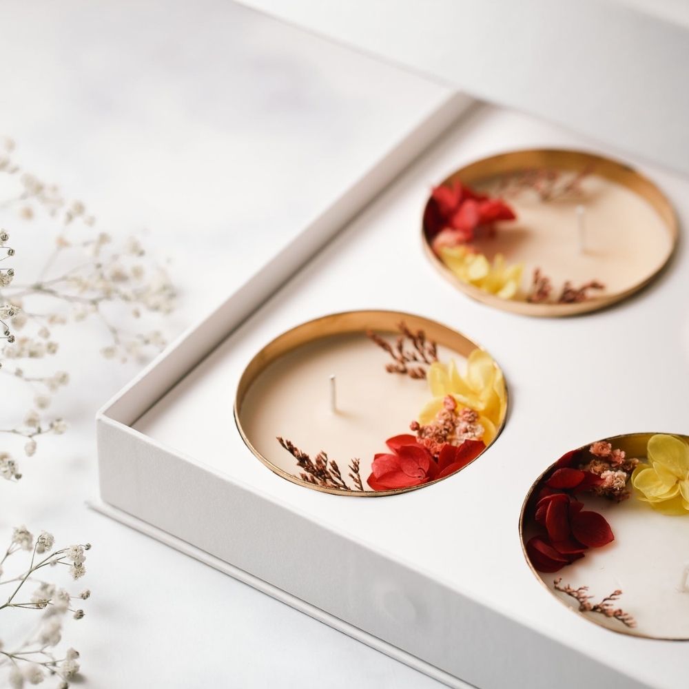 Set of 4 – 3" Copper Finish Urli Candles (50 ml each) with Natural Flower Embellishments.